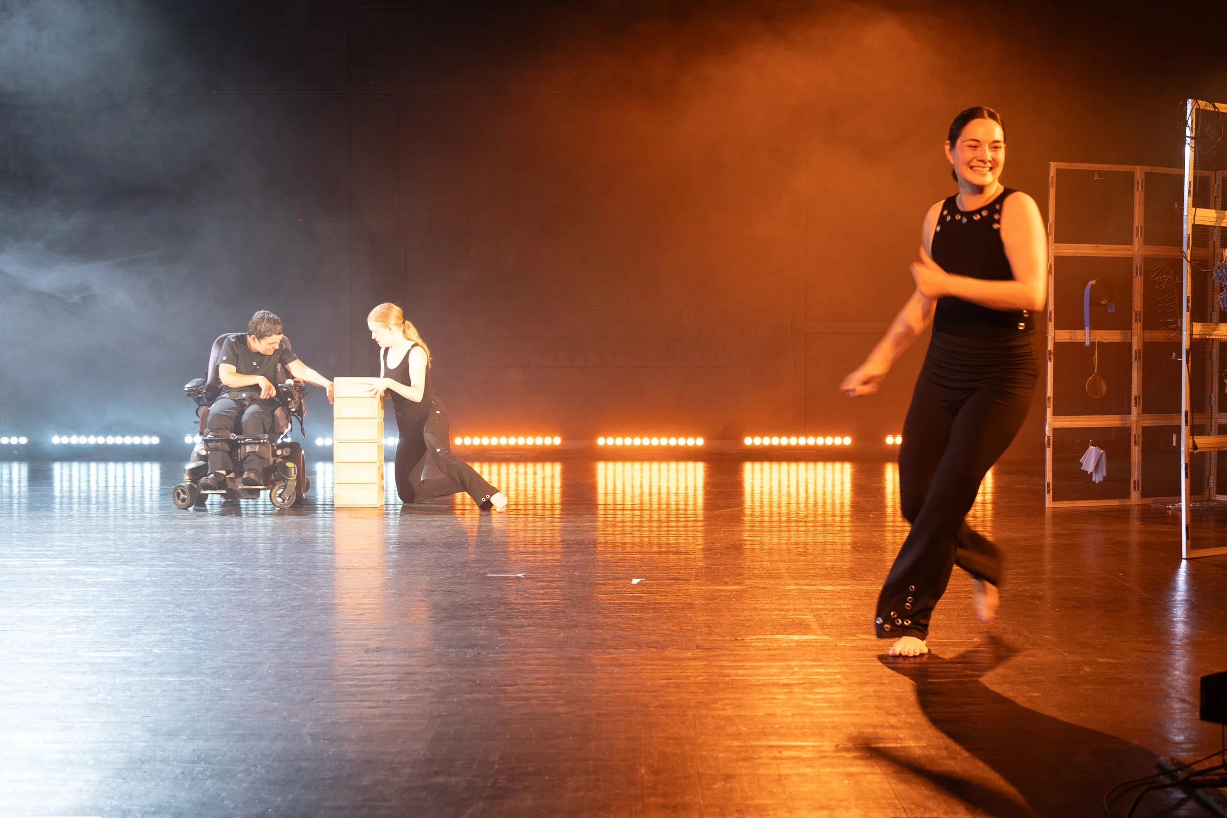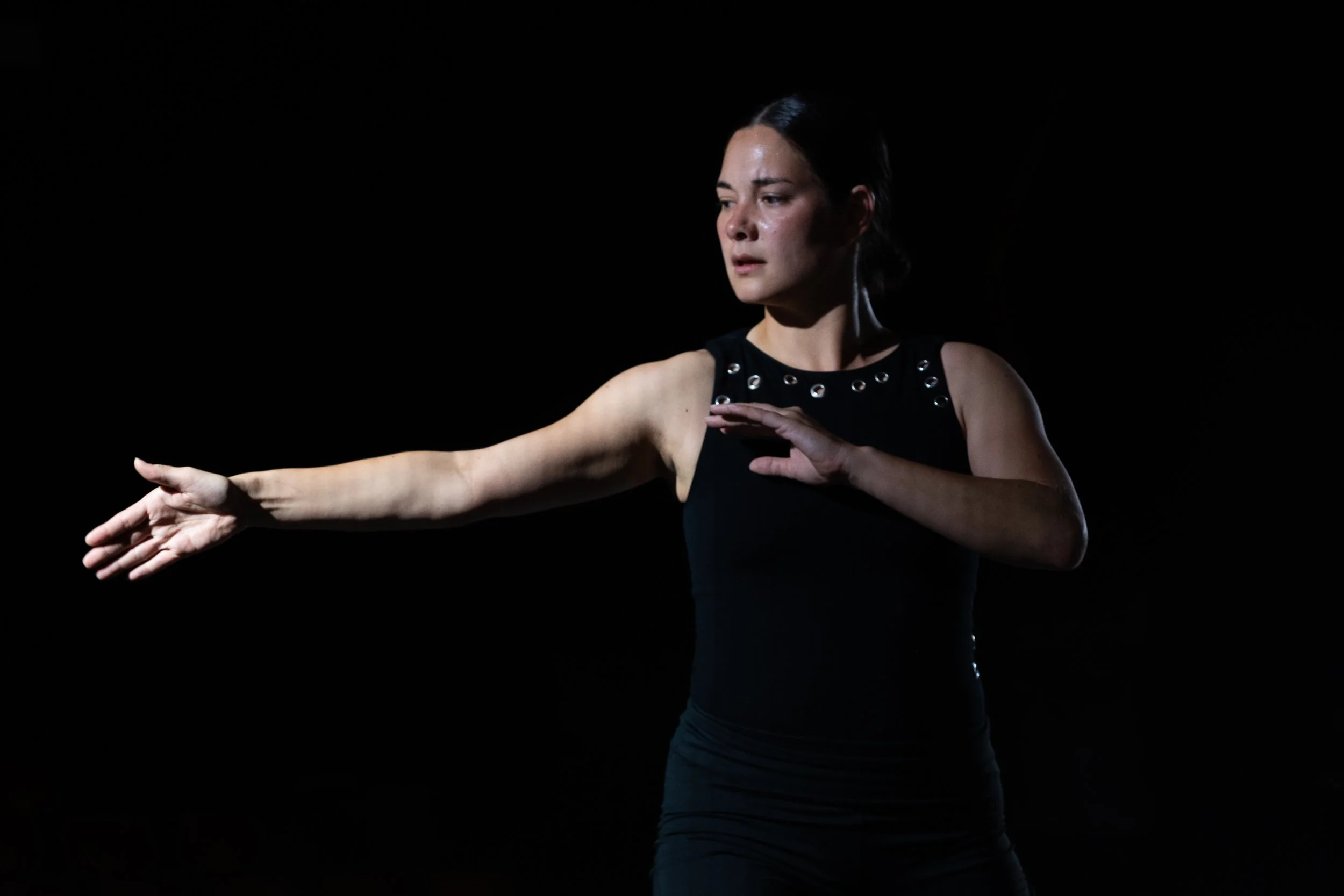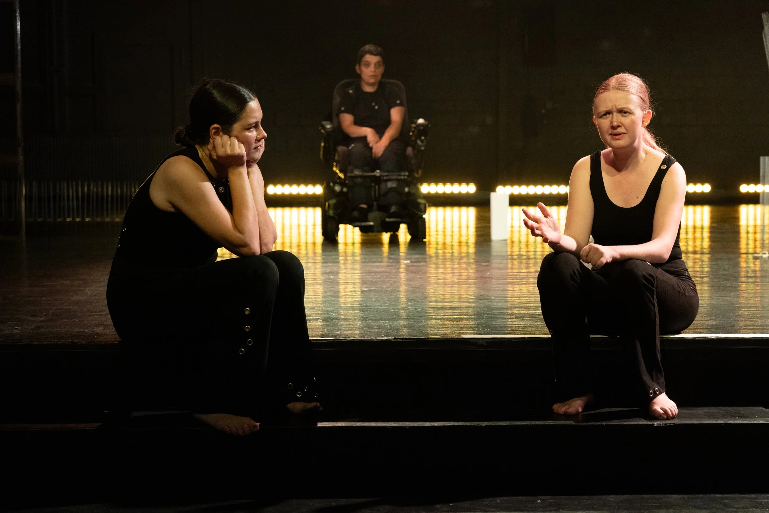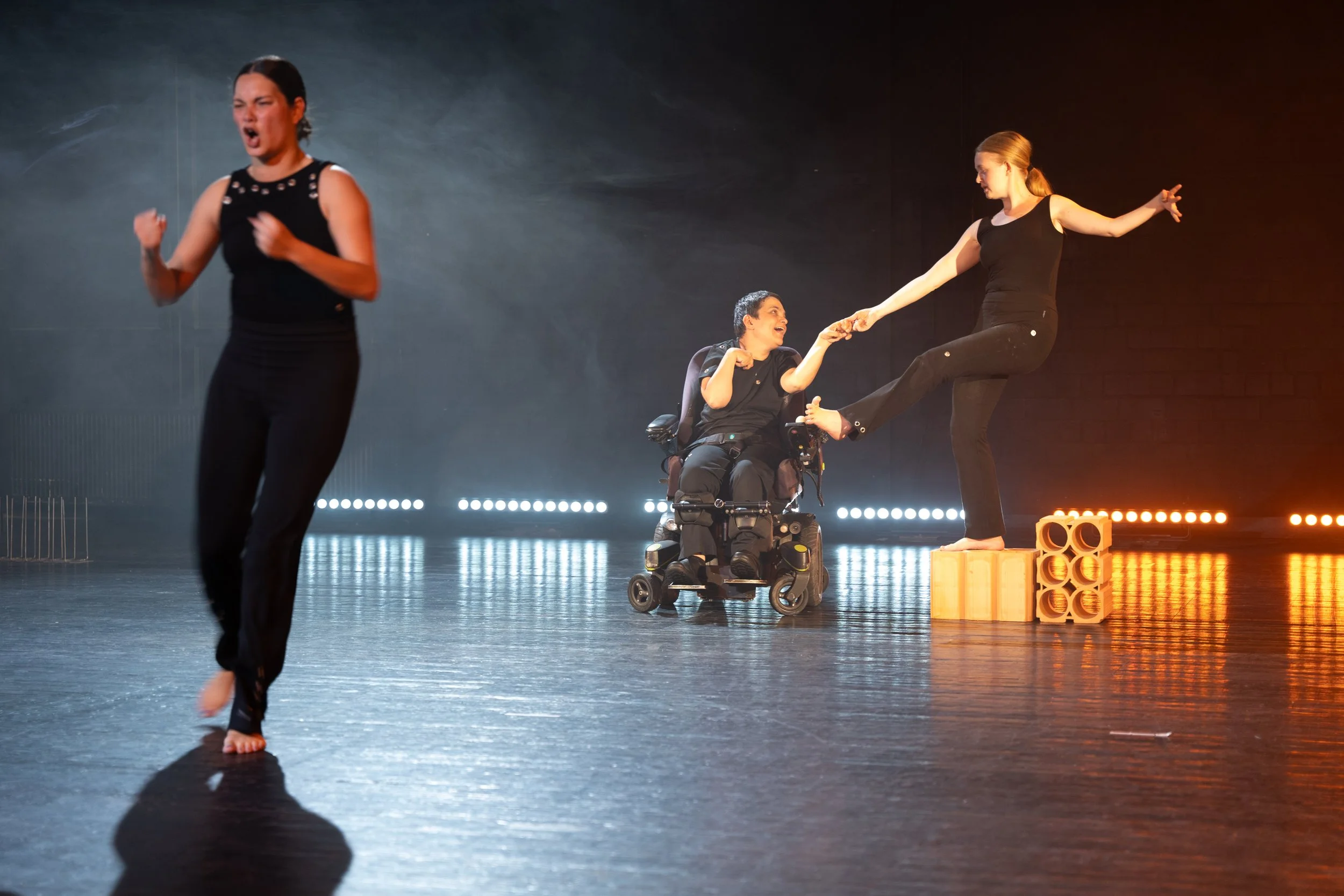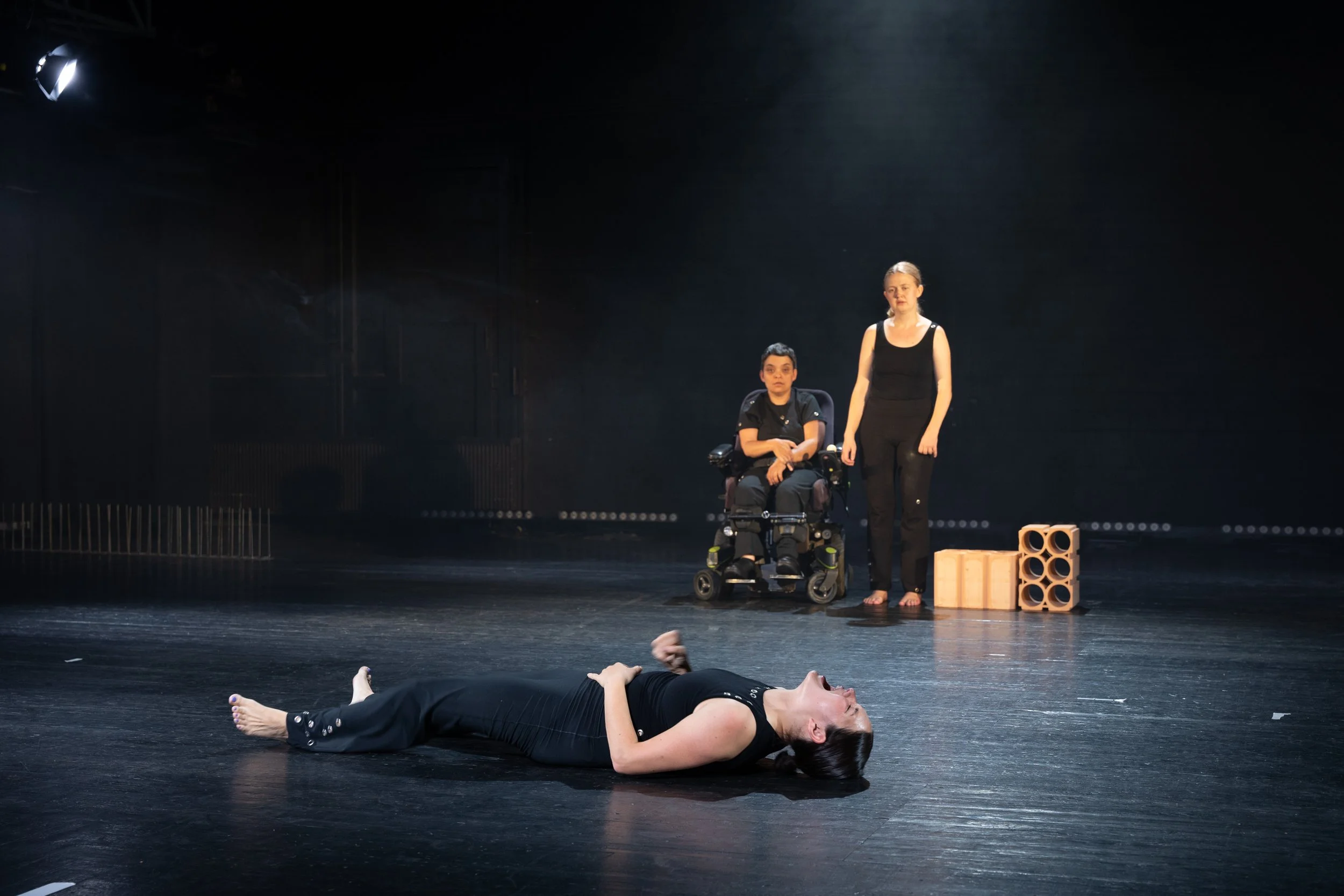 KLICKEN SIE HIER FÜR LEICHTE SPRACHE erzählt von Momenten des Anders-Seins und dem Umgang damit. Drei unterschiedliche Frauen suchen nach eigenen Formen des Erzählens von Anbeginn bis an die Grenzen des sprachlichen Ausdrucks. Verbunden sind sie durch eine Wut auf die normierende Gesellschaft und durch Bewegung als Notwendigkeit.